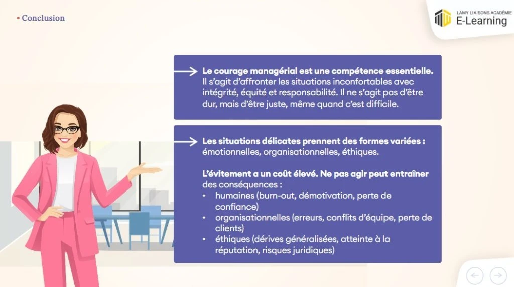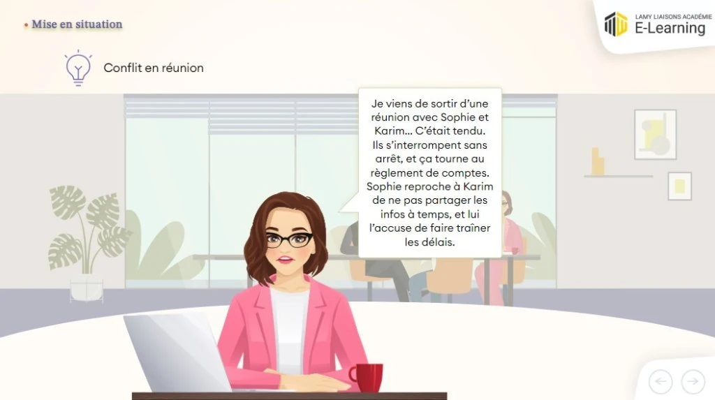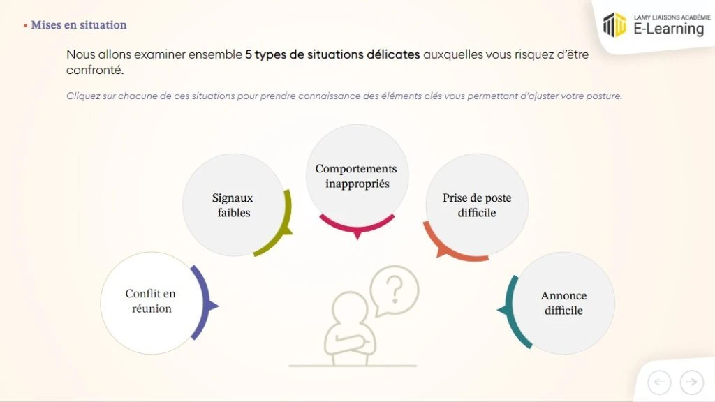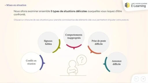 Ce module e-learning propose une approche pragmatique de la gestion des situations délicates : il s’appuie sur des mises en situation réalistes et sur un environnement graphique immersif. Il fait partie de la collection « Stratégies de leadership » qui comprend 5 modules.