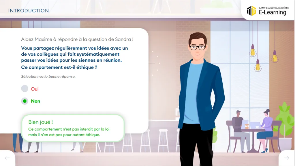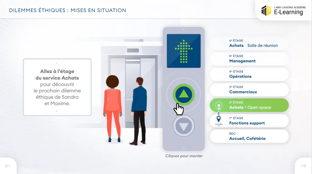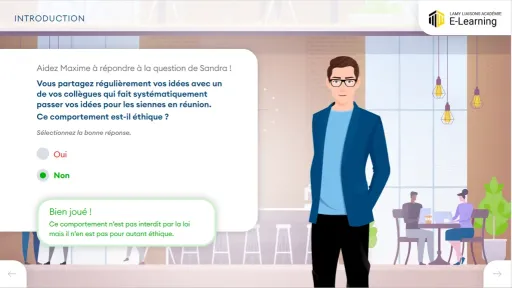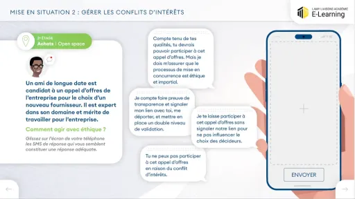 • Mises en situation : Protéger les actifs de l’entreprise / Gérer les conflits d’intérêts / Lutter contre les discriminations / Favoriser une concurrence loyale / Agir avec intégrité / Décider avec impartialité.
