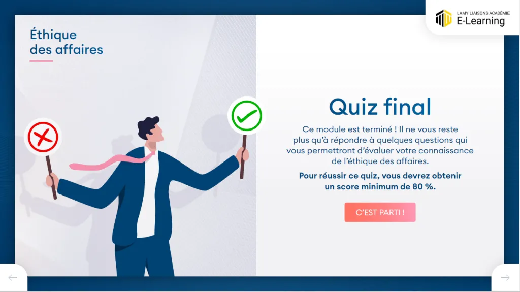 L’éthique se définit comme l’ensemble des principes moraux qui sont à la base de la conduite d’une personne. Au-delà des aspects légaux, chaque collaborateur est confronté à des dilemmes éthiques dans sa pratique professionnelle : sur plusieurs thématiques comme la protection des actifs, la concurrence loyale, les principes de non-discrimination, l’adoption de pratiques commerciales ou collaboratives vertueuses. En renforçant la culture éthique dans l’entreprise, chaque membre de l’organisation apprendra à adopter des comportements éthiques au quotidien. Grâce à des mises en situation concrètes et des outils pratiques d’aide à la décision, ce module vous permettra de vous familiariser avec les meilleures pratiques éthiques. Que ce soit par exemple lors du lancement de nouveaux produits ou lors de la gestion des impacts environnementaux, les collaborateurs seront capables d’aborder chaque défi éthique avec confiance et pragmatisme.