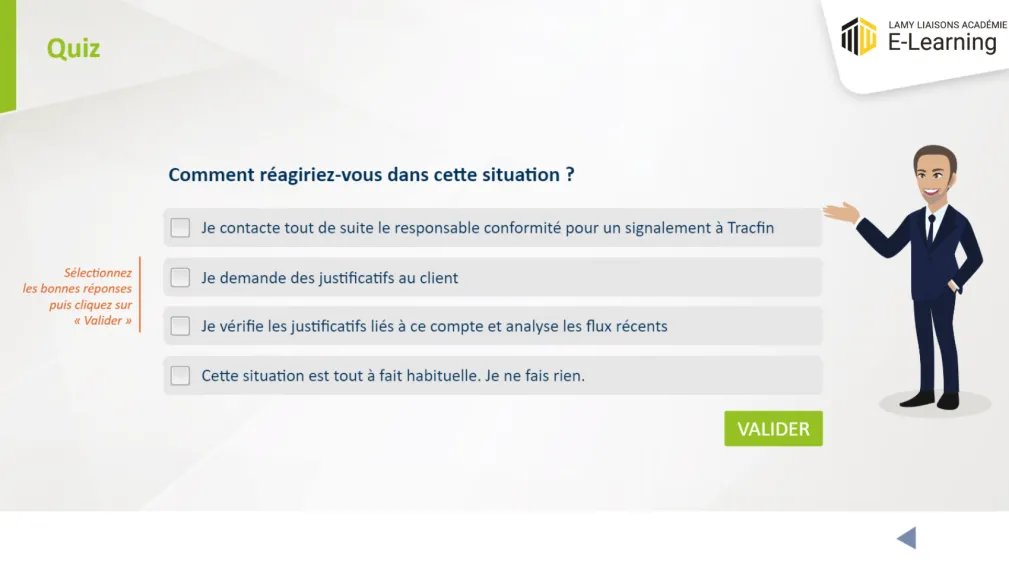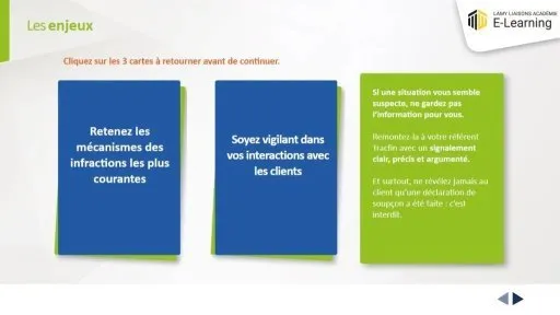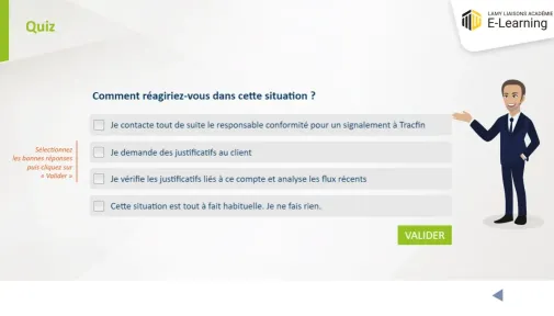 Activité particulièrement exposée aux risques de blanchiment de capitaux et de financement du terrorisme, le secteur des assurances est soumis à des obligations réglementaires strictes en matière de conformité LCB-FT. Cette formation e-learning LCB-FT assurance permet aux professionnels de mieux comprendre les enjeux liés à la lutte contre le blanchiment dans leur domaine, d’identifier les situations sensibles et d’adopter les bons réflexes. Une approche pratique et ciblée pour répondre aux exigences réglementaires et limiter les risques de non-conformité.